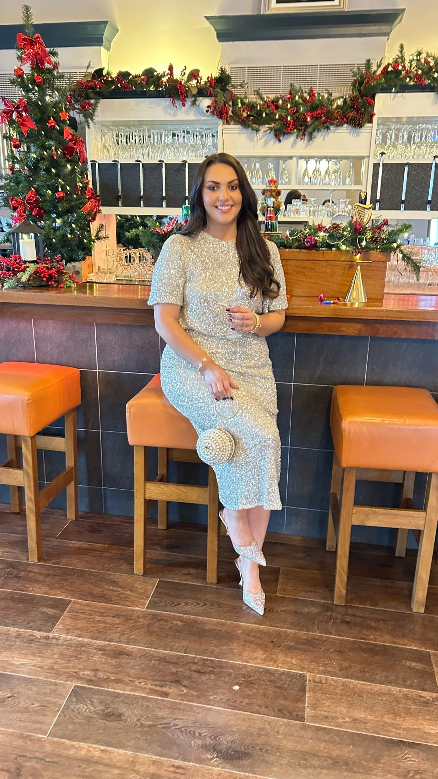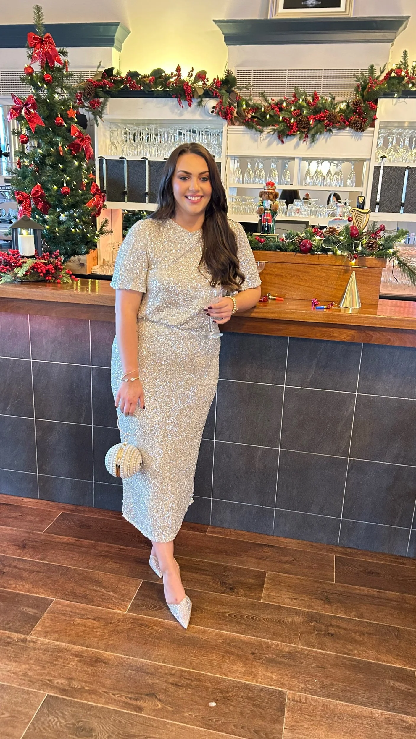 Stand out in this dazzling sequin pencil skirt. Delicately embroidered with shimmering sequins and fully lined, this midi length skirt exudes effortless femininity and style. A thick elasticated waist detail and a small front slit make this piece sure to turn heads. Fully lined. No irritation from sequins